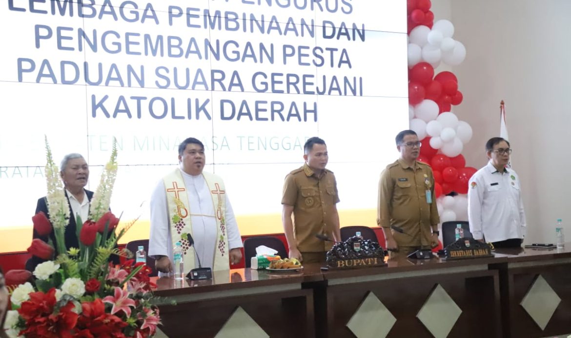 MINAHASA TENGGARA – Pemerintah Kabupaten (Pemkab) Minahasa Tenggara secara resmi melantik Pengurus Lembaga Pembinaan dan Pengembangan Pesta Paduan Suara Gerejani Katolik Daerah (LP3KD) Kabupaten Minahasa Tenggara. Pelantikan ini dipimpin langsung oleh Bupati Ronald Kandoli di Kantor Bupati, Senin (23/10/2023).